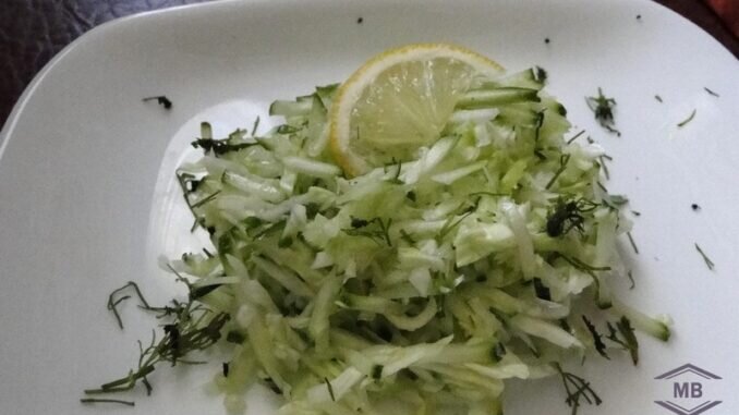 Витаминный, освежающий салат, на приготовление которого потребуется не более 10 минут! Попробуйте приготовить салат из капусты с кабачком. Ингредиенты: 300 грамм капусты, 300 грамм молодого кабачка, 1-2 столовых ложек сока лимона, соль и перец — по вкусу, укроп и лук пером – по вкусу, пол чайной ложки сахара, 3-4 столовые ложки растительного масла. Процесс приготовления: Молодой кабачок очищаем шинкуем тонкой соломкой. Добавляем к кабачку сок лимона. Перемешав, даём промариноваться около 5 минут. Свежую капусту также шинкуем соломкой. Лук пером, укроп и петрушку (по желанию) мелко рубим. Отправляем всё к кабачку и перемешиваем. Салат солим по вкусу, добавляем сахар и перец. Заправляем растительным маслом. Отличные салаты, которые стоит попробовать: салат с нутом, черри и сладким перцем, «Неженка», «Кучеряшка», а также салат «Солнечный». Приятного аппетита и полезного перекуса!