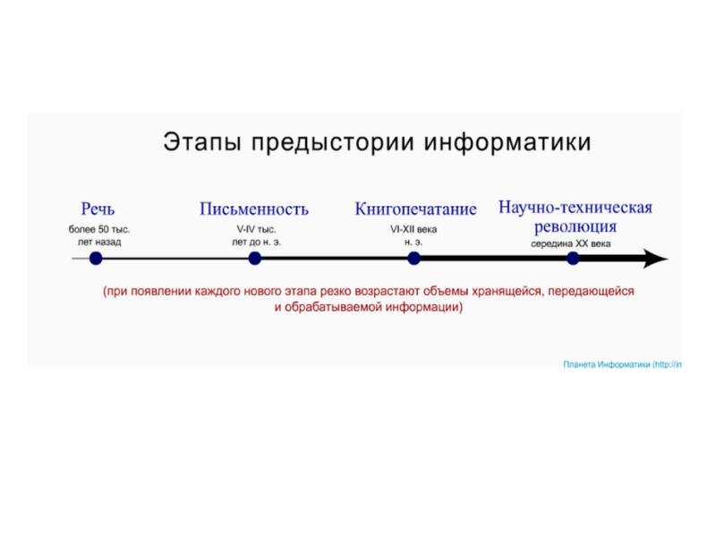 История развития информатики История информатики как науки началась со второй половины XX века. Это было связано с появлением и распространением ЭВМ и начавшейся компьютерной революцией. Появление вычислительных машин в 40-50-е годы создало для информатики необходимую аппаратную поддержку, то есть благоприятную среду для ее развития как науки. Однако, несмотря на свою короткую историю, информатика имеет длительную предысторию, связанную с особенностями накопления и обработки информации на разных этапах развития человеческого общества. Таким образом, всю историю информатики можно подразделить на два больших этапа: предысторию и саму историю. Предыстория информатики Предыстория информатики начинается с появления социального общества. В предыстории выделяют ряд этапов. Каждый из них характеризуется резким возрастанием по сравнению с предыдущим возможностей хранения, передачи и обработки информации. Первый этап – освоение человеком развитой устной речи. У древних людей членораздельная ре