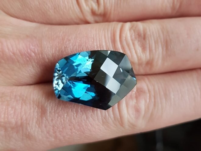 Его окраску часто описывают как выразительный ярко-синий. В памяти всплывают васильки и ультрамарин, цвет яркого весеннего неба. Но это ошибочно. Подобное описание больше подходит к сапфирам. Лондонский топаз скорее дымчатый, синий с примесью серого и иногда зелёного. Этот цвет густой и насыщенный, но вовсе не яркий. Даже огранённые и отполированные до блеска они сохраняют приглушённость окраски, абсолютно прозрачный минерал остаётся тёмным.
