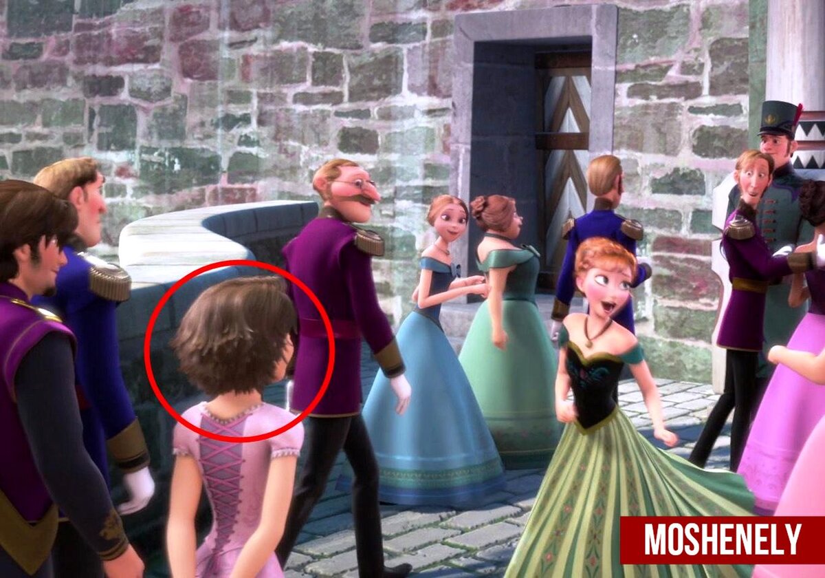 Если вы внимательно посмотрите на всех гостей, которые прибыли в замок, то заметите там одну занимательную парочку, которую можно было увидеть в мультфильме "Рапунцель: Запутанная история" — это Флинн и сама Рапунцель. Они находятся слева.