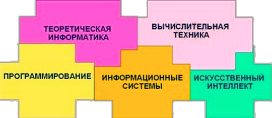 Не вдаваясь в прикладные информационные технологии, расскажу вам составные части «ядра» современной информатики. Каждая из этих частей может рассматриваться как относительно самостоятельная научная дисциплина, но все они есть части одной большой науки. Теоретическая информатика – часть информатики, включающая ряд математических разделов. Она опирается на математическую логику и включает такие разделы, как теория алгоритмов и автоматов, теория информации и теория кодирования, теория формальных языков и грамматик, исследование операций и др. Теоретическая информатика использует математические методы для изучения процессов обработки информации. Вычислительная техника – раздел, в котором разрабатываются общие принципы построения и функционирования вычислительных систем. Речь идет о принципиальных решениях на уровне архитектуры вычислительных систем, определяющей состав, назначение, функциональные возможности и принципы взаимодействия устройств. Примеры принципиальных классических решен