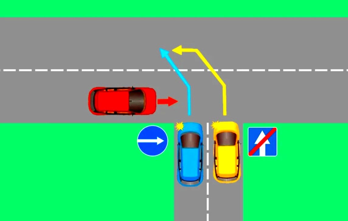 Сегодня будет немного нестандартная задача: придется не только вычислить очередность проезда транспортных средств (ТС), но и найти нарушителя правил дорожного движения. Итак, дорожная ситуация: Нерегулируемый Т-образный перекресток, на который собирается въехать три ТС. Какой автомобиль проедет вторым? Также ответьте и на этот вопрос: водитель какого автомобиля нарушает ПДД? Если вы любите решать задачи по ПДД, то переходите на главную страницу канала - новые материалы публикуются каждый день (или подпишитесь, чтобы не потерять нас :-)). Ну и по традиции опрос: Начнем с поиска нарушителя. Долго думать не нужно: желтый и синий автомобили находятся на односторонней дороге (вернее в конце односторонней дороги, но это ничего не меняет) - оба собираются поворачивать налево. Для поворота налево необходимо занять крайнее левое положение, чего не сделал водитель желтого автомобиля. Вот вам и нарушитель. Перекресток, на который собираются въезжать ТС, является перекрестком равнозначных дорог, о
