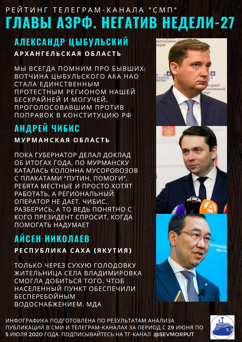 Главная новость недели - НАО стал единственным протестным регионом в России, не поддержавшим поправки в Конституцию. Почему в рейтинге не Бездудный, спросите вы? Потому что с ним уже давно все ясно, а вот автор предложения о объединении регионов, практически выходец из НАО, и стал реальным автором протестного голосования жителей, прославившего регион на всю Россию. Его пример - другим наука. И если другим врио пример пойдет скорее на пользу (большинство из них перекрестились, что не получили подобные результаты), то остальные протестные регионы могут взять на вооружение эту тактику - и прокатить на ближайших выборах как врио, так и правящую партию.