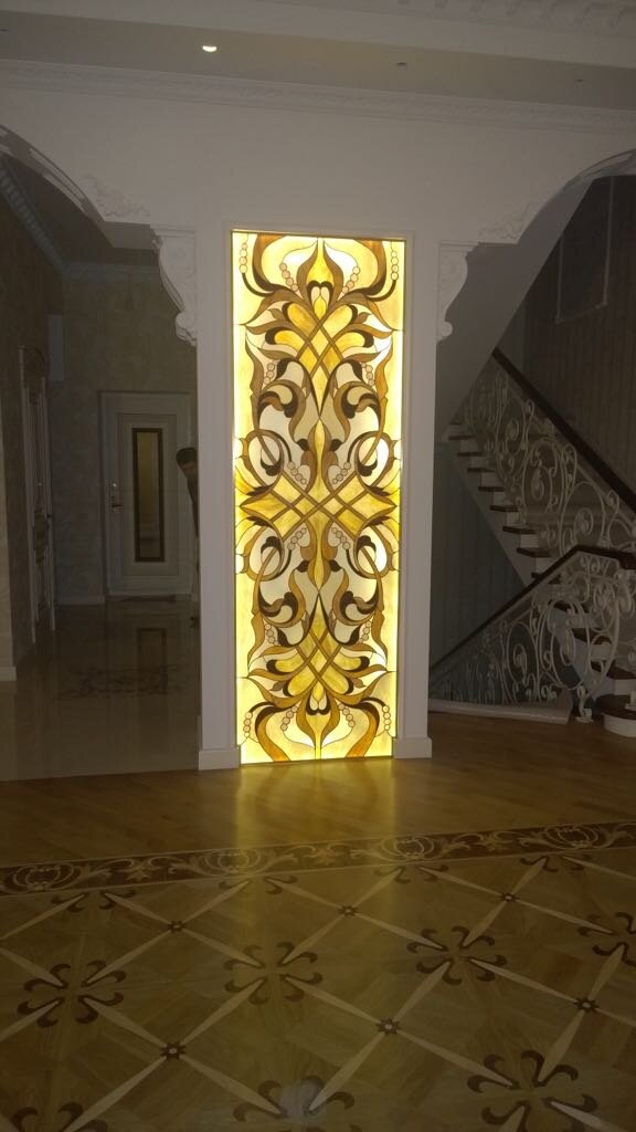 Эффектной альтернативой традиционной картине в интерьере станет витражное панно в раме со встроенной подсветкой. Яркое фактурное полотно станет композиционным центром интерьера, а скрытая подсветка позволит картине выполнять функцию настенного светильника с мягким приглушённым светом.