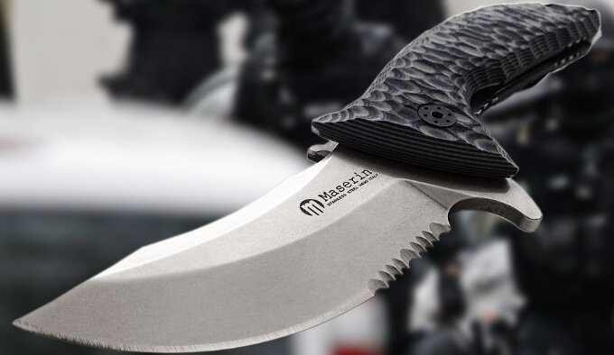 - закругляющееся почти с центра лезвие комбинированной формы с крупным отступом от "пяты"/"рикассо" и зубчатым односторонним "серрейтором" в начале,