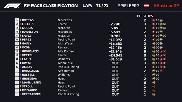 Что ж в первых двух частях мы обсудили всех пилотов, кто увидел клетчатый флаг и тех кто всё же был классифицирован в итоговом протоколе гонки. Осталось обсудить и проанализировать короткую гонку тех, кто сошёл с дистанции по тем или иным причинам. Гран-при Австрии: гонка, обзор по гонщикам+ оценка, часть 1! Гран-при Австрии: гонка, обзор по гонщикам+ оценка, часть 2! Сходов было много, до финиша не добрались 2 команды в полном составе! В основном причиной были поломки технических элементов, но были и интересные, красивые сходы, из-за банальной человеческой халатности. Результаты гонки: 14 место -Кими Райкконен Оценка 9/10 Такую высокую оценку Кими получает за самый красивый сход в этой гонке! Шучу конечно не зато хоть и надо признать, что механики Альфы действительно подарили нам один из ярчайших моментов гонки. Кими проводил супер боевую гонку на просто ужасной Альфе Ромео. Стартовав 19-м он прорывался вперед и каким-то чудом прессинговал середнячков- другую Альфу и Рено. Два ра