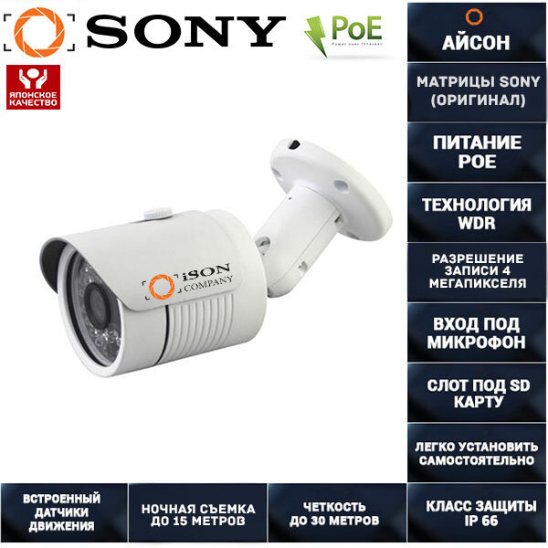 5) На пятом месте у нас 4-х мегапиксельная камера видеонаблюдения ISON IP50S-R 4MP с питанием POE, слотом под SD карту, входом под микрофоном и функцией расширения динамического диапазона WDR. 4-х мегапиксельные IP камеры видеонаблюдения больше всего покупают монтажные организации для участие в тендерах на гос. Объектах по 44-фз а также для участия в тендерах на крупных коммерческих объектах типа Лукойл и Газпром, Автоваз по 223-фз. Такие камеры видеонаблюдения ставятся в банки, торговые сети, муниципальные предприятия, крупные промышленные предприятия и т.д.