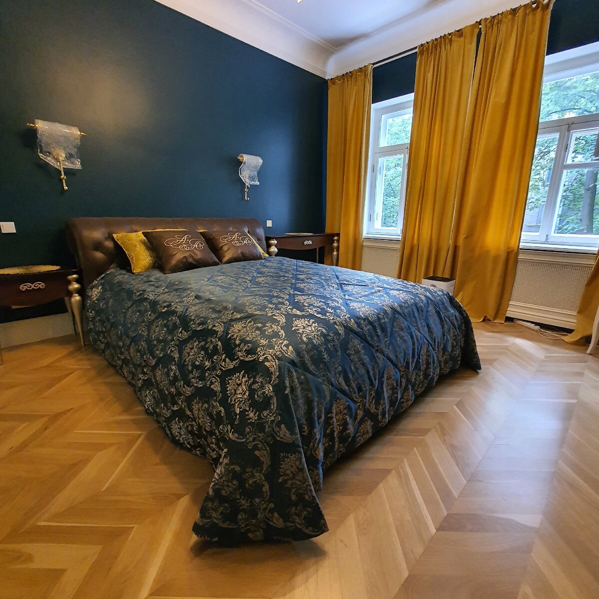 Дизайн комнаты подобен оркестру, в котором каждый инструмент имеет свое четкое место, знает, когда вступать и какие ноты играть. В текстильном оформлении все точно так же, только место аккордеонов, домр, виолончелей и гитар появляются подушки, скатерти, покрывала, шторы, салфетки и многое другое. Спальня В спальне одного из наших последних проектов, на Московском проспекте, мы познакомились с необычным интерьером — креативным, как и сама его хозяйка. Требовалось оформить саму кровать, а точнее — покрывало в цвет стен. Признаемся честно, количество каталогов, которые мы пересмотрели, не пересчитать по пальцам одной руки. И все не то! По счастливой случайности оказалось, что прихватили с собой образец с другого объекта. И именно он оказался “тем самым”. Основа ткани идеально подошла к стенам, а рисунок подчеркнул металлические элементы и шторы. Совпадение? — Что мы говорим о совпадениях?