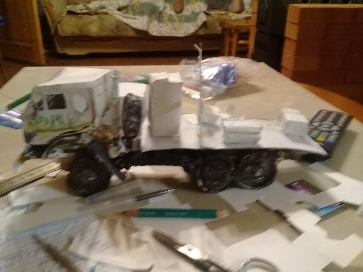 Мир Вам! Здравствуйте! Расскажу Вам, как собрал модель КамАз 43114 из картона. Модель начал собирать в 2017году, взяв за основу выкройки от NovaModels и фотографии из интернет и реальной флюорографии переджной (передвижки). Процесс сборки. Выкройки деталей вырезал и наклеивал на картон, используя опыт сборки пожарной машины ЗиЛ 130 от той NovaModels. В качестве картона использовал упаковку от пластиковых моделей. Раму собрал относительно хорошо. Правда ,пришлось повозиться из-за того ,что когда вез её домой, помял слегка. Поэтому ,отказался от мысли с поворачивающимися передними колёсами. Заднюю подвеску сделал сам . Но как всегда напутал с размерами, и колёса сделаны не крутящимися по инструкции. После изучения схемы сборки колёс, удалось их собирать. При сборке кабины , появились затруднения. Двери не хотели приклеиваться к днищу кабины и отваливались. Думал что они тяжелые и правую дверь клеил поэтопно , опираясь на инструкцию. Но, всеравно ,получилась щ