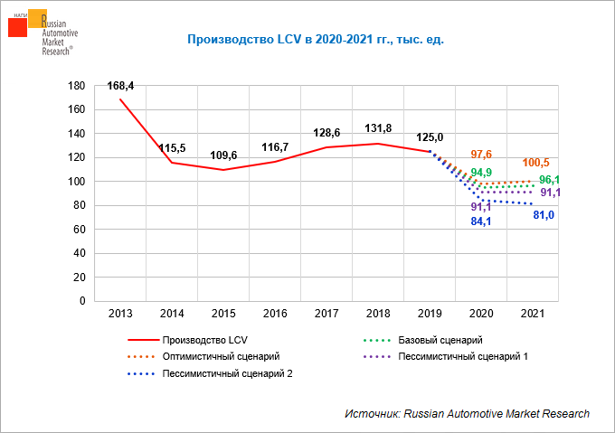 В январе-мае 2020 г. производство LCV сократилось на 30,5% по отношению к аналогичному периоду 2019 г., в мае 2020 г. снижение составило 34,1%. За исключением производителя Автотор, который показал положительную динамику производства LCV за счет низких производственных результатов прошлого года, все производители легкого коммерческого транспорта в рассматриваемый период сократили выпуск автомобилей. Ведущие производители – ГАЗ, АвтоВАЗ, УАЗ и Форд Соллерс Елабуга – снизили производство на 32,1%, 34,2%, 41,3% и 5,8%, соответственно. Согласно базовому сценарию прогноза, производство LCV в 2020 г. снизится на 24,1% по сравнению с 2019 г. и составит 94,9 тыс. ед. По оптимистичному сценарию сокращение продаж составит 21,9%, по пессимистичному – 27,1%. При условии повторного введения ограничительных мер, связанных со второй волной COVID-19, сокращение производства может составить 32,7%. Прогноз по производству транспортных средств сформирован с построением трех сценариев: базового, оптимист