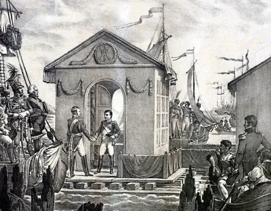 В июне 1807г. французская армия разгромила русские войска под Фридландом. Наполеон вплотную подошел к границам Российской империи, и Александр I был вынужден пойти на мирные переговоры. Утром 25 июня оба императора – Наполеон с тильзитского берега, Александр с противоположного – одновременно вступили в лодки и поплыли к импровизированному плоту, специально сооруженному посередине реки Неман. Результатом переговоров стало подписание Тильзитского мирного договора 7 июля, ровно 213 лет назад. 8 интересных фактов о событии. 1. Первые слова Александра Наполеону при встрече: «Государь, я ненавижу англичан так же, как и вы!» - «В таком случае, - отвечал Бонапарт, улыбаясь, - все будет улажено, и мир упрочен». 2. Императоры встретились тет-а-тет, без свит (Наполеон: «Я буду вашим секретарем, а вы – моим»). 3. Предложение русского самодержца привлечь к переговорам прусского короля Бонапарт отверг по-солдатски цинично: «Я часто спал вдвоем, но втроем – никогда». 4.