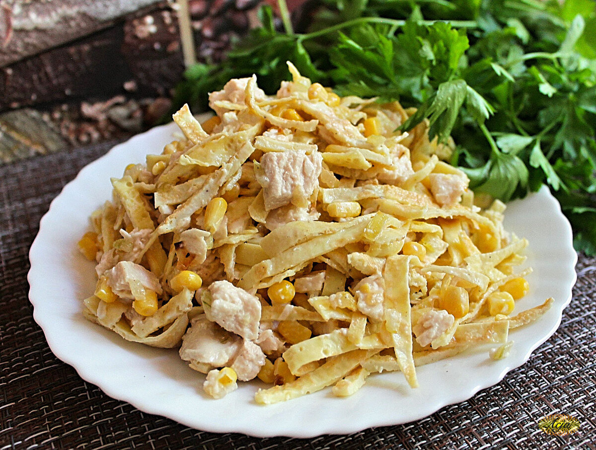 Сегодня делюсь рецептом салата с курицей, кукурузой и яичными блинчиками. Салат получается сытным и вкусным, а для его приготовления потребуется минимум продуктов. Ингредиенты: Куриное филе - 1 шт.; Яйцо - 4 шт.; Кукуруза - 1/2 баночки; Майонез - 3-4 ст.л.; Лук - 2 шт.; Соль, перец - по вкусу. ЛИСТАЙ≫ Сначала сварим куриную грудку. В кастрюлю наливаем воду, солим, добавляем лавровый лист и перец горошком. Отправляем куриную грудку в воду и варим с момента закипания минут 20-25 до готовности. ЛИСТАЙ≫ Для приготовления блинчиков каждое яйцо отдельно разбиваем в миску, добавляем по щепотке соли и перца, взбиваем. Разогретую сковороду смазываем растительным маслом, выливаем яйцо, равномерно распределяем по сковороде и жарим с двух сторон до золотистой корочки. ЛИСТАЙ≫ Две средние луковицы мелко нарежем и обжарим на небольшом количестве растительного масла до золотистого цвета. ЛИСТАЙ≫ Остывшее куриное филе нарезаем на небольшие кусочки. Яичные блинчики складываем друг