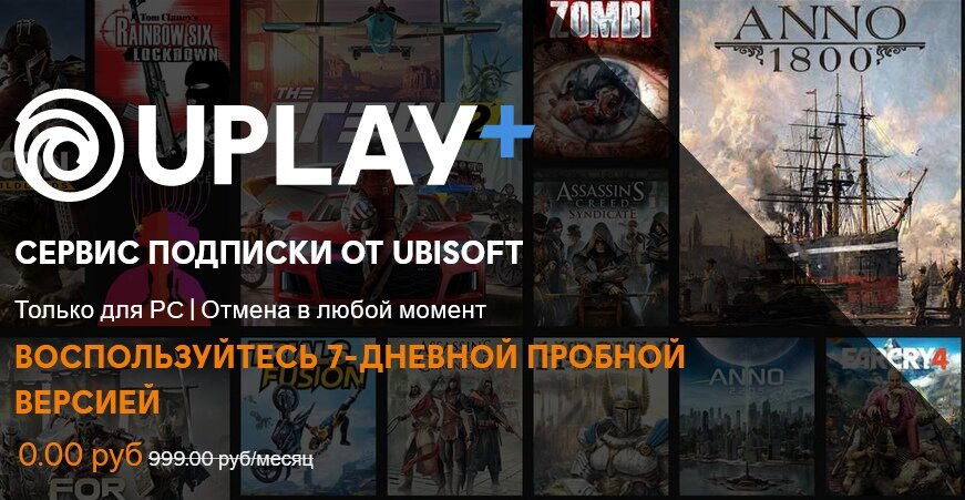 Ubisoft раздает 7-дневный триал на свой подписочный сервис Uplay+. Там много крутых игр со всеми DLC и Deluxe изданиями. Все тайтлы серии Assassin's Creed, Far Cry, Tom Clancy's и другие. Полный список игр, доступных для беплатной игры можно найти здесь. Получить триал может аккаунт, у которого ранее не был куплен Uplay+. Для получения триала требуется привязка карты. Работает с виртуальными картами. После получения триала можно сразу отвязать карту и триал не пропадет. Получить недельный триал можно с 7 по 27 июля. Особо предприимчивые товарищи могут запастись аккаунтами с 7-дневным доступом чуток впрок :)