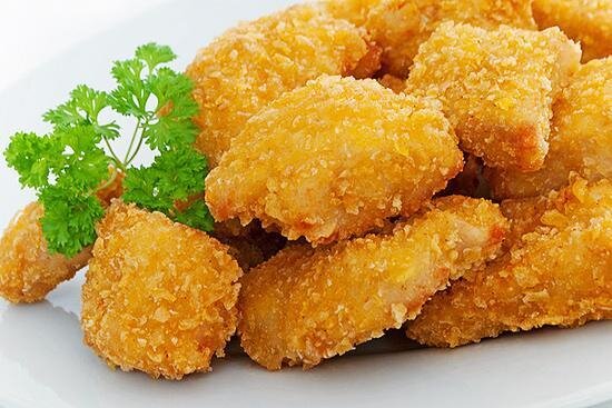 Хочу поделиться рецептом вкусных, сочных и хрустящих куриных шариков с сыром. Для приготовления вам понадобится: 1. Куриный фарш - 1 кг; 2. Сыр - 50 гр; 3. Панировочные сухари 4. Яйцо куриное - 1 шт; 5. Соль, перец - по вкусу 6. Растительное масло - 3ст.л. В первую очередь готовим куриный фарш, добавляем в него соль и перец, тщательно перемешиваем. Затем формируем шарики из фарша и добавляем во внутрь кусочек плавленого сыра. Обмакиваем каждый шарик сначала в яйцо, затем в панировочные сухари и в масло. Выкладываем наггетсы на противень и ставим в духовку на 20 минут при температуре 180 градусов. Приятного аппетита!!!
