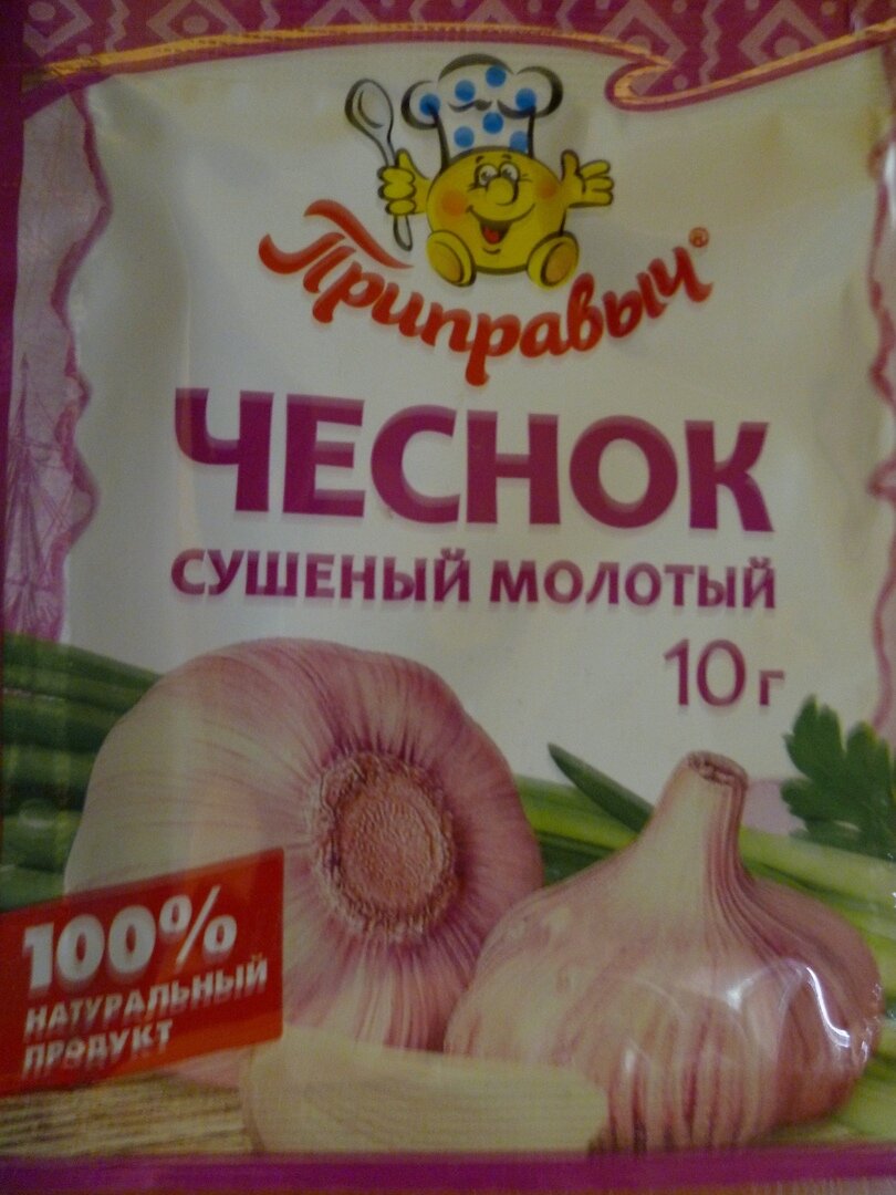 Сегодня буду говорить о чесноке, который продается в виде порошка. Итак, чеснок сушеный, срок хранения – 24 месяца, энергетическая ценность 260 ккал. В пакетике 10 грамм, стоит что-то около 10 рублей.