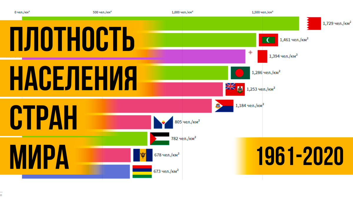 ТОП-15 Стран по плотности населения на один квадратный километр 1961-2020 Плотность населения — число жителей, приходящееся на 1 км² (квадратный километр) территории. В видео представлены страны по плотности населения, которые вошли в рейтинг стран с самой высокой плотностью населения по данным ООН с 1961г. по 2020 год. Обратите внимание! Из-за того, что переписи населения в разных государствах проводятся в разные годы, а оценки не всегда являются точными, единовременно собрать все точные и актуальные данные практически невозможно. Поэтому данный список не является исчерпывающим источником информации, он представляет лишь условный порядок стран по плотности населения.