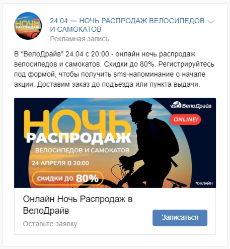На рекламу события у нас было всего 8 дней, с 17 по 24 апреля. Начинать рекламу распродажи задолго до ее начала не имеет смысла, так как планы людей изменчивы, особенно в период самоизоляции и связанной с ней нестабильностью. Чем больше промежуток времени между регистрацией и событием, тем меньше вероятность того, что человек примет участие в акции. С учётом того, что привлечение каждого участника требует средств, начать сбор заявок ранее было бы коммерчески невыгодным.