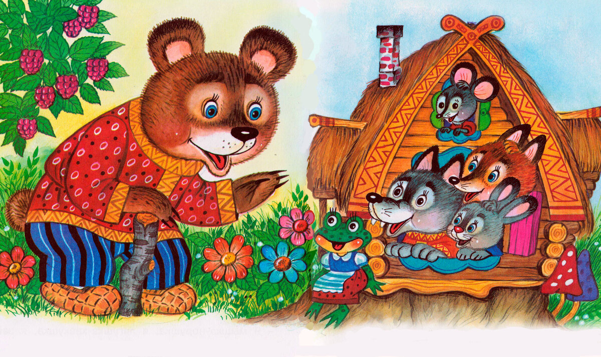 Стоит в поле теремок. Бежит мимо мышка-норушка. Увидела теремок, остановилась и спрашивает: — Терем-теремок! Кто в тереме живет? Никто не отзывается. Вошла мышка в теремок и стала там жить. Прискакала к терему лягушка-квакушка и спрашивает: — Терем-теремок! Кто в тереме живет? — Я, мышка-норушка! А ты кто? — А я лягушка-квакушка. — Иди ко мне жить! Лягушка прыгнула в теремок. Стали они вдвоем жить. Бежит мимо зайчик-побегайчик. Остановился и спрашивает: — Терем-теремок! Кто в тереме живет? — Я, мышка-норушка! — Я, лягушка-квакушка! — А ты кто? — А я зайчик-побегайчик. — Иди к нам жить! Заяц скок в теремок! Стали они втроем жить. Идет мимо лисичка-сестричка. Постучала в окошко и спрашивает: — Терем-теремок! Кто в тереме живет? — Я, мышка-норушка. — Я, лягушка-квакушка. — Я, зайчик-побегайчик. — А ты кто? — А я лисичка-сестричка. — Иди к нам жить! Забралась лисичка в теремок. Стали они вчетвером жить. Прибежал волчок-серый бочок, заглянул в дверь и спрашивает: — Терем-теремок! Кто в тере