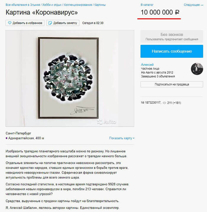 Вот забавные примеры объявлений и большие деньги на панике вокруг эпидемии коронавируса. Подобные объявления быстро блокируют, но они появляются снова. Энергичные и предприимчивые деятели, желающие заработать на страхе и панике людей не переведутся, наверное, никогда. Находчивые российские предприниматели желают заработать любой ценой, для них грех не воспользоваться ситуацией с повсеместной паникой и страхом перед заболеванием. Они пытаются продавать товары и услуги, которые якобы помогут спастись от заражения коронавирусом и даже избавиться от него! Пейте "Волшебную" воду и не болейте! Эту водичку продают в разных городах Росси