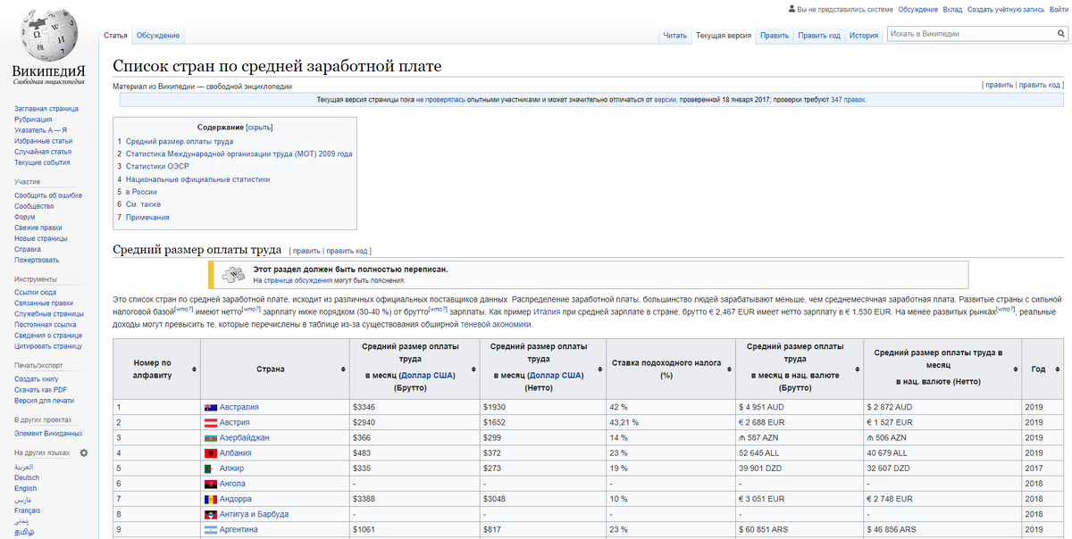 Привет, речь пойдет про средние зарплаты в разных странах. Я считаю эту тему интересной, потому что статистика всегда говорит много, а мы сейчас будем анализировать статистику. Я так и забил в гугле: "средние зарплаты в мире". Открыл по первой ссылке статью в wiki. Тут самое интересное начинается... Мне сразу же захотелось узнать в какой стране самая большая зарплата. Данные указаны в долларах, но гораздо нагляднее будет в рублях, поэтому интересные позиции я переведу в рубли. Пробежимся по таблице. Номер страны по алфавиту нас не интересует. Страны мы будем смотреть, а далее средний размер оплаты труда в долларах брутто и нетто. Что это значит? Не беспокойтесь всё очевидно, брутто - до вычета подоходного налога, а нетто - после. Поэтому нетто нас и интересует. Можно также узнать средний подоходный налог. И да, если вы вдруг не знаете, не во всех странах подоходный налог одинаковый для всех, как в России(у нас 13%, если что). Поскольку именно нетто - это деньги дошедшие до человека, п