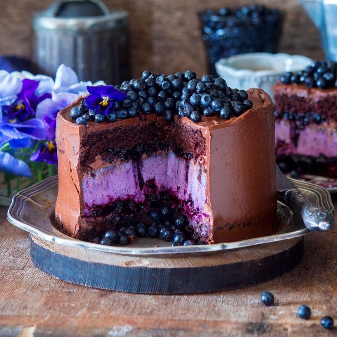 Ягоды можно брать, конечно любые, малину, чёрную смородину, вишню, как в принципе и бисквиты с кремом можно взять любые ваши любимые. Чизкейк удобно печь, выложив форму (можно и неразъёмную), большим куском пергамента и потом за концы пергамента вытаскивать его из формы и переносить на торт. ⠀ Ингредиенты на форму 15-18 см. ⠀ Для чизкейка: ✔️300 гр. сливочного сыра типа "Филадельфия" комнатной t*, ✔️1 яйцо, ✔️50 гр. сахара (или по вкусу), ✔️100 гр. черничного пюре, ✔️50 гр. жирных сливок или сметаны, ✔️20 гр. кукурузного крахмала, ✔️1 ч.л. ванильного экстракта, ✔️1 ч.л. сока лимона, ✔️50-100 гр. ягод черники. ⠀ Для бисквитов на 2 формы диаметром 15 см. ✔️180 гр. муки, ✔️45 гр. какао, ✔️5 гр. разрыхлителя, ✔️3 гр. соды, ✔️75 гр. растительного масла, ✔️225 гр. сахара, ✔️1 крупное яйцо, ✔️75 гр. молока, ✔️200 гр. очень горячего кофе (кипятка). ⠀ Для крема: ✔️100 гр. сливочного масла комнатной температуры, ✔️100 гр. сахарной пудры (по вкусу), ✔️120 гр. сливочного сыра типа "Филадельфия", ✔