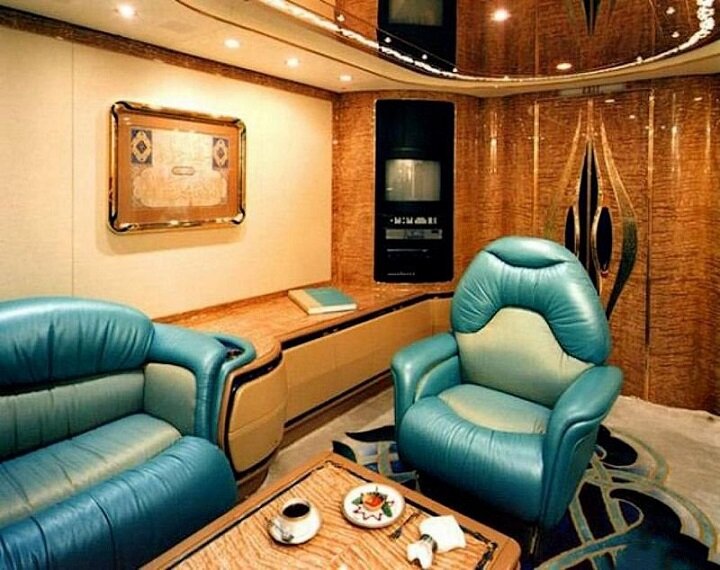 В салоне Боинга 747-430 очень удобно расположились ванная, спальня, гостиная, которые оформлены элементами позолоты. Дизайн салона выдержан строго в восточном стиле. Его украшают ковры ручной работы и фурнитура, изготовленная из чистого золота, а отделка комнат выполнена кристаллами «Лаликью».