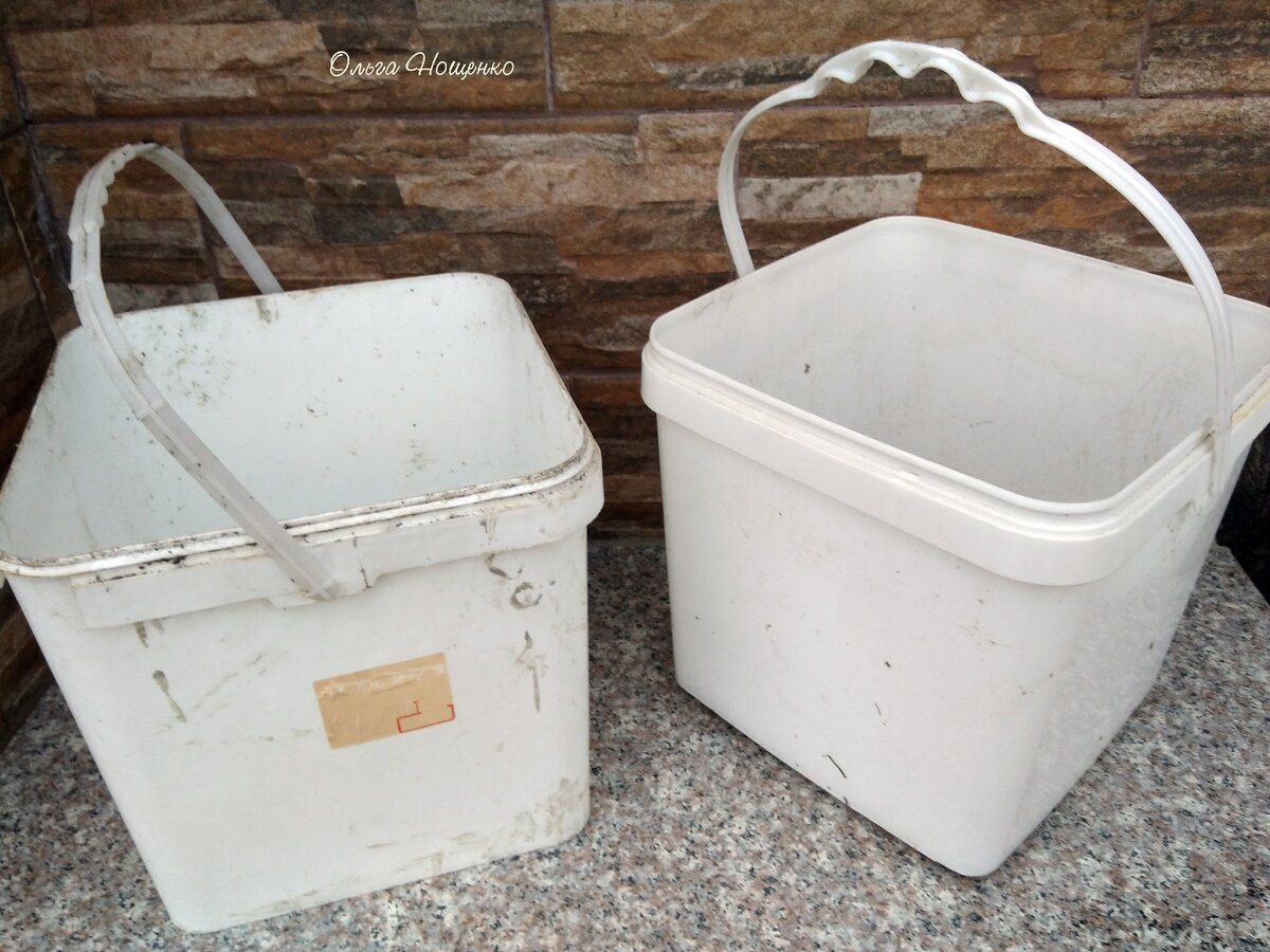 У вёдер аккуратно удалила ручки. Отмыла от остатков земли. Дренажные отверстия уже были сделаны. Снаружи обработала вёдра крупной наждачной шкуркой, чтобы поверхность не скользила, и было хорошее сцепление с цементным раствором.
