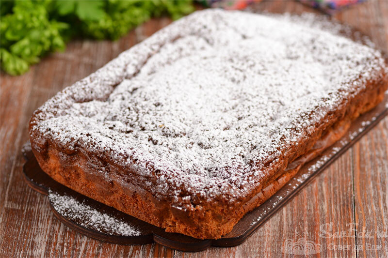 9. Пирог перекладываем на тарелку или доску и по желанию посыпаем сахарной пудрой. С ней пирог становится еще ярче.