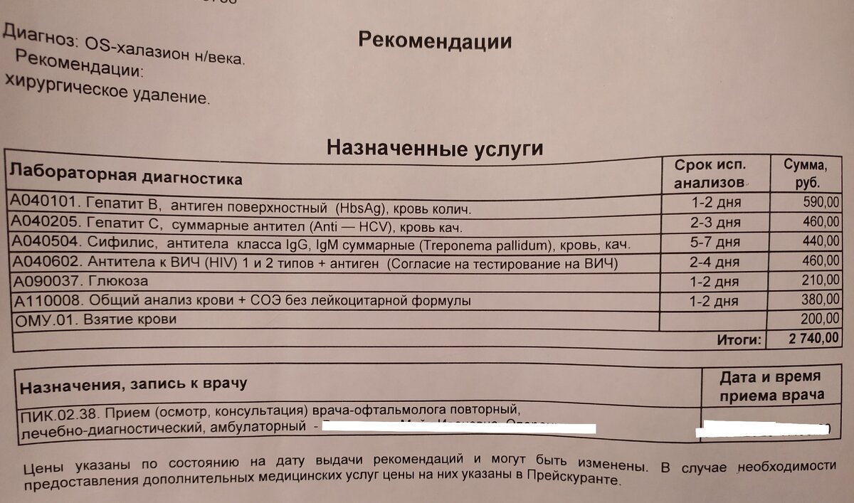 Началось все с того, что потерев глаз, я заметила небольшую выпуклость округлой формы на внутренней стороне нижнего века. "Горошина" не доставляла никакого дискомфорта, кроме того, что раздражала меня. Как человек современный, я стала искать название болезни в интернете. Халязион. Закупоривание сальной железы. Звучит страшно, но больше всего меня напугало слово "хроническая" в описании болезни. Как хроническая? Ведь это первый раз появилось. Через несколько месяцев, когда я поняла, что само ничего не пройдет, а халязион понемногу увеличивался, я записалась к офтальмологу. Примерно два месяца у меня эта "градина". Первая консультация у врача стоила 950 рублей из-за того, что я впервые обратилась в эту клинику. Врач назначил операцию, которая стоит 16500 + 1000 (наркоз). В среднем же ценники на подобные операции варьируются от 3500 до 10000 рублей в Санкт-Петербурге. Тогда я не знала этого. Испугавшись, что все станет хуже, что я стану циклопом и сильно себя накрутив (на здоровье денег