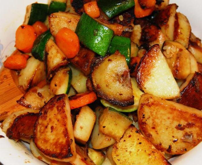 на 1 порцию нам понадобится: Сырой картофель нарезать брусочками, дольками или кубиками.Сырой картофель перед жаркой промыть в холодной воде, чтобы кусочки не склеивались и не прилипали к противню, затем его слегка отсушить. Для этого после промывки положить его в дуршлаг или сито, чтобы стекала вода. Для жарки картофеля можно использовать широкий ассортимент жиров - масло сливочное, топленое, растительное; сало свиное и говяжье; жир домашней птицы; различные маргарины и т.п. Чтобы картофель равномерно прожарился, нужно укладывать его на сковороду или противень не более 5см. Когда на нижних слоях картофеля образуется поджаристая корочка, его следует перемешать.Если при жарке на плите картофель не дошел до полной готовности, т.е. не полностью стал мягким, его следует поставить на несколько минут в жарочный шкаф.Подавать картофель горячим с огурцами или помидорами.