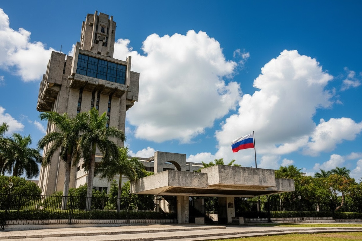 Комплекс советской дипломатической миссии в кубинской столице строили с 1978 по 1987 год под руководством Александра Рочегова (архитектор) и Марии Энгельке (художник). Здания расположились в районе Мирамар на 5 авениде, которая идет параллельно пляжам, и заняли почти 3 гектара. В проекте уживаются и горизонтальные линии (здания от 2 до 6 этаже), и вертикальные (главное высотное административное здание, чуть напоминающее меч, воткнутый в землю). При строительстве учитывался местный жаркий и солнечный климат: для фасадов использовали местный ракушечник, для отделки внутренних интерьеров — прохладный мрамор, оборудовали много теневых навесов и глубоких лоджий. Внутренние переходы расположились под крышей, а окна нарочито сделали небольшими, чтобы защититься от солнца. Здания утопают в зелени клумб и газонов, растет множество фруктовых деревьев и декоративных кустов, работает большой красивый фонтан и два просторных бассейна с морской водой.