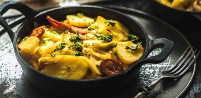 соль и перец 1. Очистить картофель, нарезать кружочками и выложить в форму для запекания. Посолите, поперчите и залейте его пивом. Поставьте в духовку на 200 ° C, до размягчения. 2. Лук и колбаски также нарезать кружочками и обжарить с измельчённым чесноком на масле. 3. Затем смешайте все ингредиенты в миске с яйцами, солью и перцем и выложите в антипригарную сковороду.
