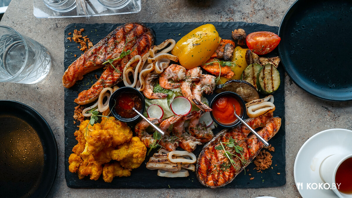 Рыбное плато строго на компанию из 2 -3 человек, охарактеризую как тарелка под вино. Сет «Морской» стоит 42,50р/1050г, а там 2 стейка лосося, 6 хвостов тигровых креветок, кальмары, 4 вида овощей на гриль и соусы. Лучшее вложение денег в ужин. Если ваш сет будет выглядеть не так, пишите мне в личку!