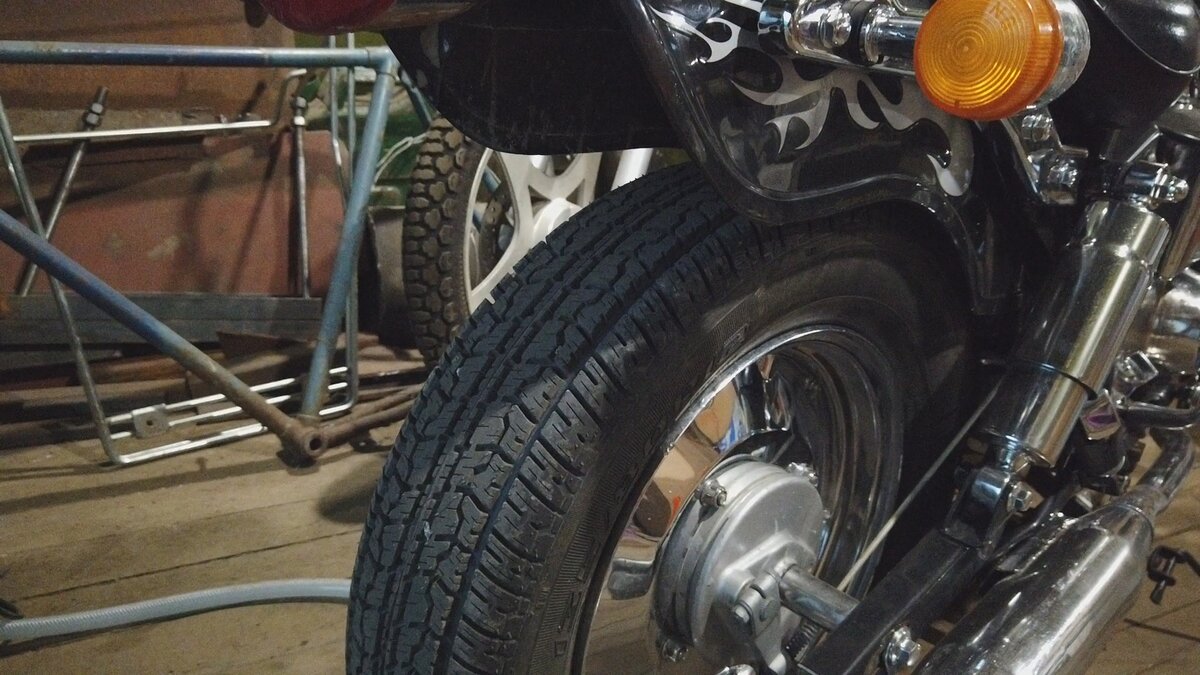 Всем привет! Наконец то я заменил рваную резину на заднем колесе,на покрышку от Оки,ну и поменял масло в двигателе т.к. проехал на нём более 1000 км.!