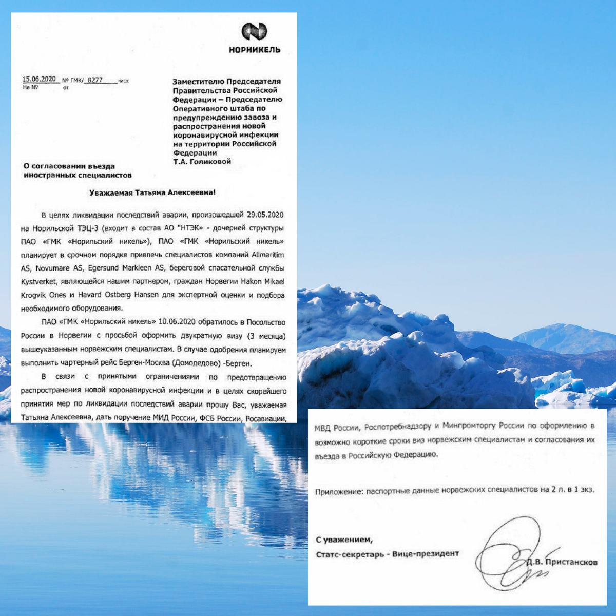 Вице-президент Норникеля Дмитрий Пристансков просит главу оперштаба по коронавирусу помочь с оформлением виз для норвежских специалистов, которых компания привлекает для ликвидации последствий чудовищной аварии. Голикову просят дать поручения ФСБ, Росавиации, Минпромторгу и другим ведомствам, чтобы те не препятствовали перелёту зарубежных экспертов.