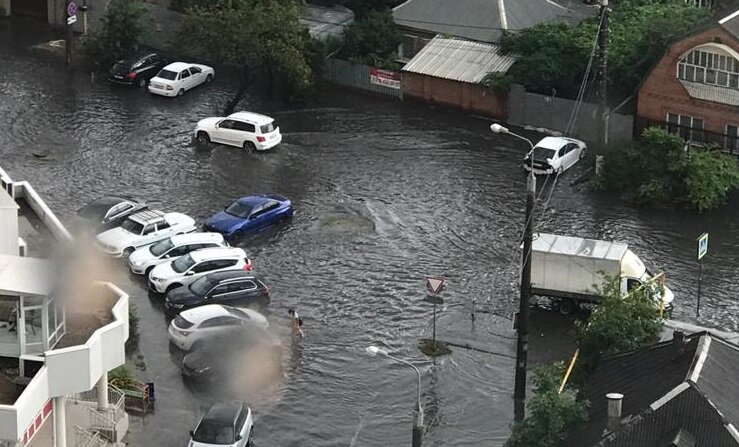 Изнуряющие от жары жители и гости Краснодара наконец-то получили долгожданный дождь. Который оказался сильным ливнем, в очередной раз затопившим улицы и остановившим общественный транспорт. Впрочем, ничего необычного. Очевидцы в соцсетях привычно сообщают о огромном количестве воды, которая превратила дороги Краснодара в одну большую пробку. Электротранспорт МУП "КТТУ", как обычно в подобных случаях, встал по всему городу. Например, в центре кубанской столицы, на именно на улице Ленина возле Союза журналистов, вода поднялась практически до входа в здание. А на дороги местами были затоплены настолько, что машины погружались в них практически до фар. Как сообщили в краевом МЧС, по состоянию на 14:00 8 июля в муниципальных образованиях Краснодар, Геленджик и Темрюкский район местами произошло скопление воды в низменных участках. В краевом центре поступило 7 заявок на откачку воды, в Геленджике вода скопилась на Центральной набережной. На момент написания данной новости, ливень в Красно