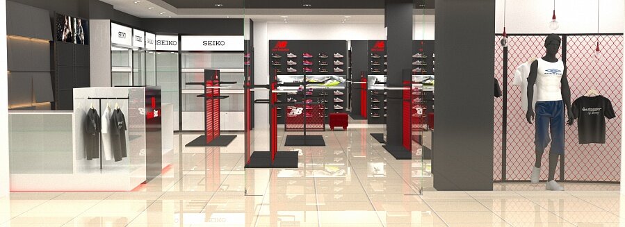 Интерьер магазина выполнен в агрессивных красно-черных тонах. Правая часть торговой площади отведена под боксерскую атрибутику, которую разместили на экономпанелях с накопителями. Центр занимают кроссовки «New balans». В левой части витрины со спортивными часами.