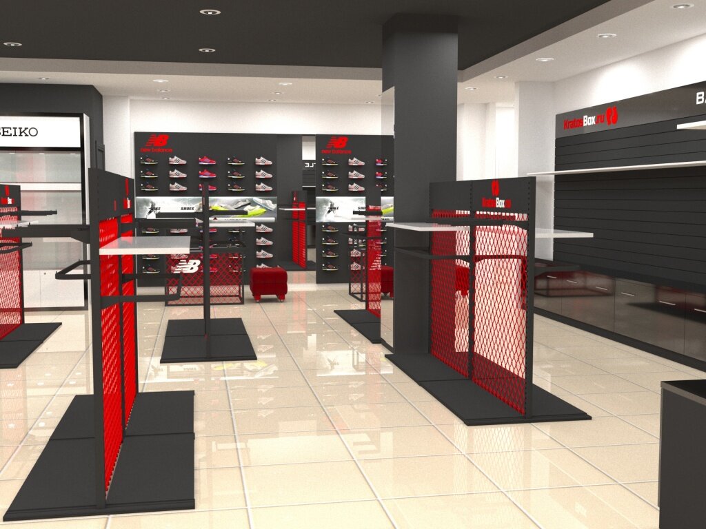 - Интерьер магазина выполнен в агрессивных красно-черных тонах. Правая часть торговой площади отведена под боксерскую атрибутику, которую разместили на экономпанелях с накопителями. Центр занимают кроссовки «New balans». В левой части витрины со спортивными часами.