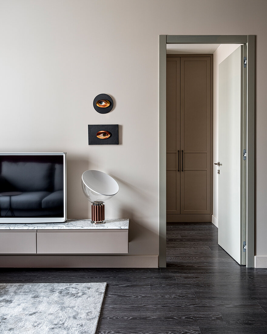 Корпусная мебель была изготовлена на заказ по эскизам автора проекта российскими столярными мастерскими. Отдельностоящие предметы от европейских марок стали примечательными акцентами. Обращают на себя внимание легкий кофейный столик Baxter, знаменитый обеденный стол фабрики Knoll по дизайну Ээро Сааринена и, конечно, свет.