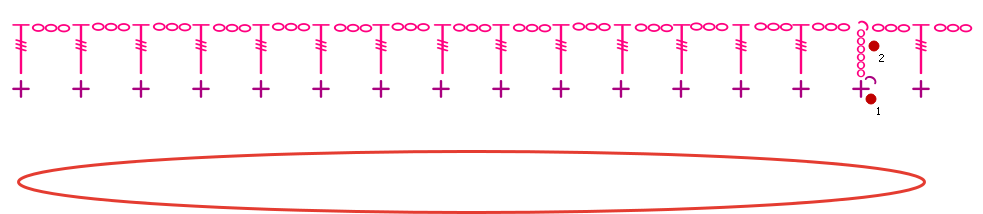 На Рис. 1 мы видим цепочку из 10 в.п., а стрелочка красного цвета указывает на петлю в которую мы будем вводить крючок и вязать первый полноценный СС3Н.