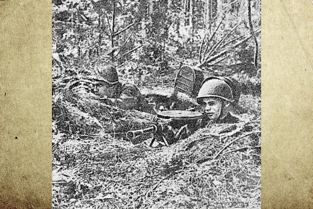 На фото: действующая армия. Красноармейцы К. Ананьев и Н. Тагаев в стрелковом окопе. Снимок специального фотокорреспондента М. Бернштейна.