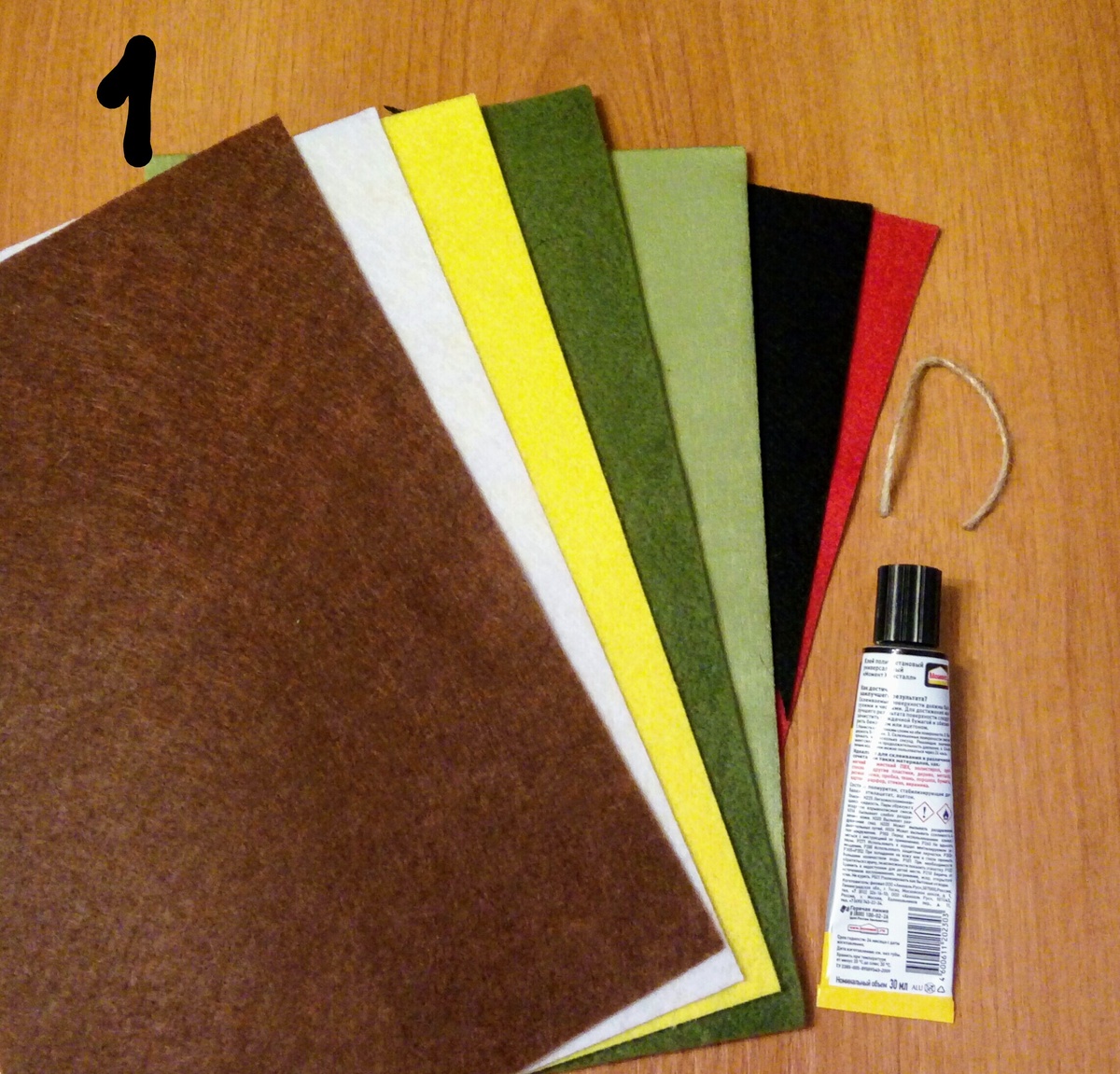 1. Для работы нам понадобятся: картон 20х30см., фетр: белый, зеленый, коричневый, желтый, красный, черный. Для основы (фона) -либо светло-зеленый фетр, либо ткань. Веревочка для петельки, две черные полубусины, клей "Момент Кристалл" (или клеевой пистолет).