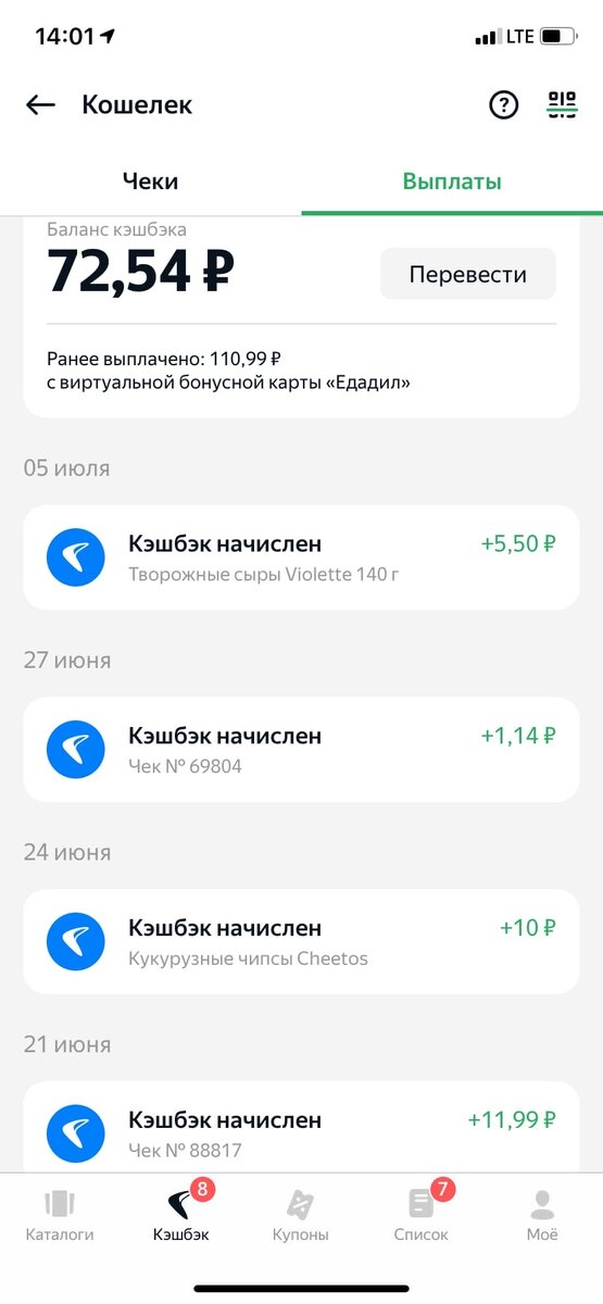 Всем привет=) Обычно я не пытаюсь гнаться за всякими кэшбэками, выискивать где бы урвать лишнюю копеечку, честно просто ЛЕНЬ ))) Но! Вот уже не первый год пользуюсь приложением, думаю многие с ним знакомы, под названием Едадил (не реклама). Для тех кто не знаком: это агрегатор скидок, где всегда можно посмотреть актуальные цены на продукты.Использую его в основном тогда, когда нужно сравнить цены в магазинах на конкретный продукт. Так вот, недавно в приложении мной была замечена вкладка "Кэшбэк". из любопытства нажала кнопочку "сканировать чек" и отсканировала код на чеке с сегодняшними покупками. На мое удивление, уже на следующий день на балансе оказалось 50 руб. С помощью кнопочки "перевести" деньги оказались на моем счете мобильного через 10 сек. Теперь после каждой покупки сканирую чеки и не плачу за телефон вообще =) Надеюсь было полезно) Благодарю за лайки,подписки и комментарии =)