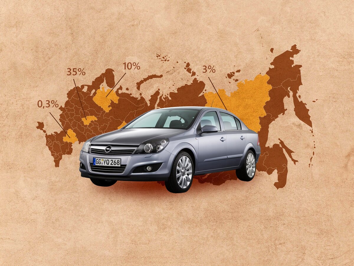 Географическое распределение предложений по стране у Astra вполне типовое. Москва пусть и не лидирует по числу машин в продаже, но формирует почти 20% вторичного рынка. В Санкт-Петербурге объявлений о продаже мало – примерно 7%. Немного меньше, чем обычно, вариантов на юге России: там сконцентрировано около 15% машин. А вот в Поволжье их даже больше, чем в Москве, – свыше 20%. Урал предлагает более широкий выбор, чем Санкт-Петербург, – около 10%. А вот по мере продвижения на восток популярность Astra заметно падает: в Сибири еще есть крохи в виде 3% предложений, а вот на Дальнем Востоке этих машин в продаже нет вообще.