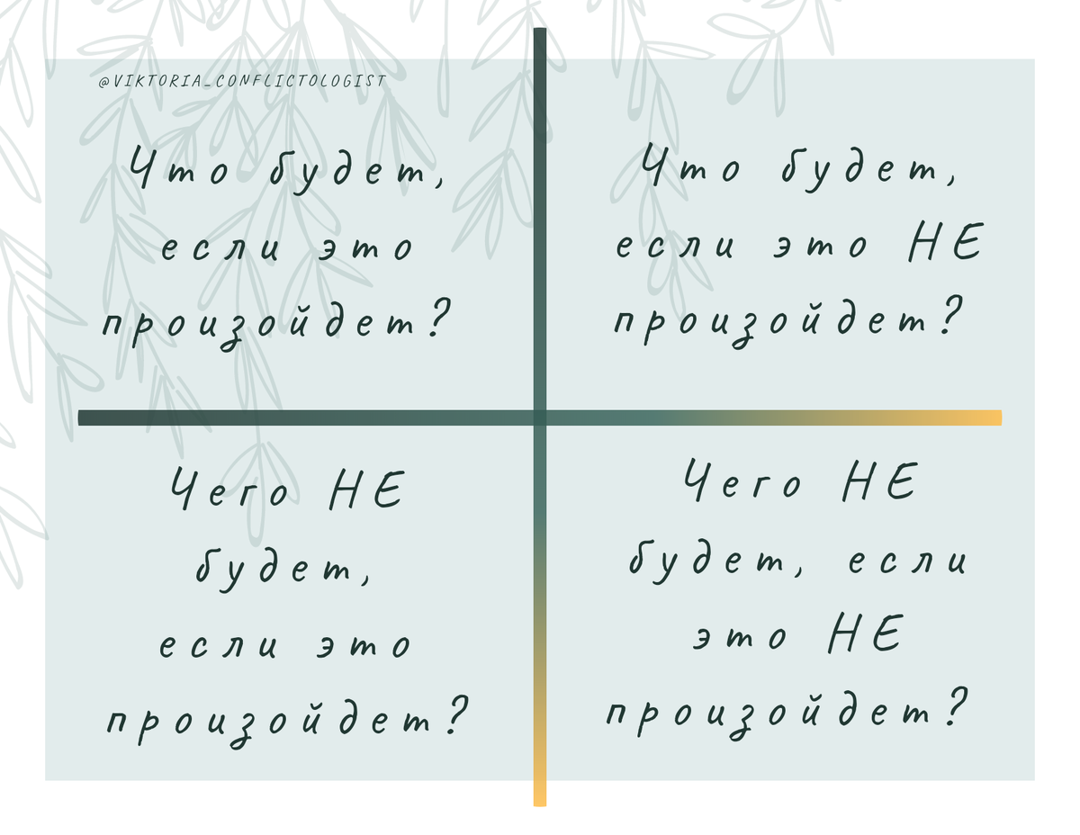 Я выбираю съесть или не съесть ещё кусочек тортика, пойти или не пойти на пару , делать или не делать предложение и т.д. Каждый новый день предлагает нам свои варианты для выбора. И в конфликте мы стоим перед необходимостью выбирать: это решение будет лучше или другое, позвонить / не позвонить... Есть множество методов помогающих сделать этот самый выбор.Один из них - это Квадрат Декарта. 1️⃣ Квадрат Декарта предлагает ответить на 4 вопроса: ⠀ ❓Что будет, если это произойдет? ⠀ ❓Что будет, если это НЕ произойдет? ⠀ ❓Чего НЕ будет, если это произойдет?⠀ ❓Чего НЕ будет, если это НЕ произойдет? Самый сложный вопрос Метод помогает нам посмотреть на ситуацию с разных сторон и найти то, что нам действительно нужно. Посмотрим на примере. Актуальный среди моих сверстников вопрос : уйти или не уйти с работы . Итак. ⠀ ❓ Что будет, если я уйду с работы? ✔️ Я буду более спокойна/спокоен. ⠀ ✔️ Я смогу посвятить время развитию/ близким/ более важным вещам в жизни. ⠀ ❓Что будет, если я не уйд