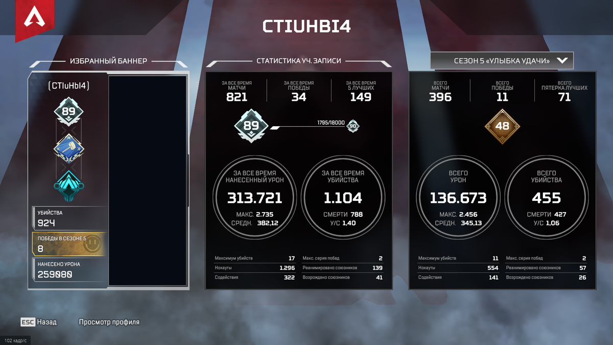 Всем привет! Я обычный игрок в Apex. Мой постоянный ранг - Платина 4! У меня был печальный опыт участия в турнире с позорным 15 местом и если кому-то станет интересно - я напишу об этом. Я долго не играл в апекс и недавно произошёл сплит. Я получил ранг - серебро 2 и стал подниматься. На данный момент мой ранг золото 4 и у меня есть просто ДИКАЯ мотивация подниматься выше! Немного о себе: Я играю в апекс меньше года и мейню патфайндера! Мой ник CTIuHbI4 (Спиныч) был придуман(Украден) после просмотра игры NaVi по кс го. Думаю многие знают мем связанный с этим ником) Мой лучший результат в рейтинге - Платина 3 О том что я буду делать: Сейчас я буду заниматься поднятием рейтинга, как минимум пока не дойду до заветного алмаза. Всё это время я буду апать рейтинг в соло и только после барьера в виде алмаза - я возможно займусь поиском команды! Отчёты о проделанной работе буду постить тут) Если вам интересен мой путь и вас есть какие либо пожелания, или советы - подписывайтесь и пишите