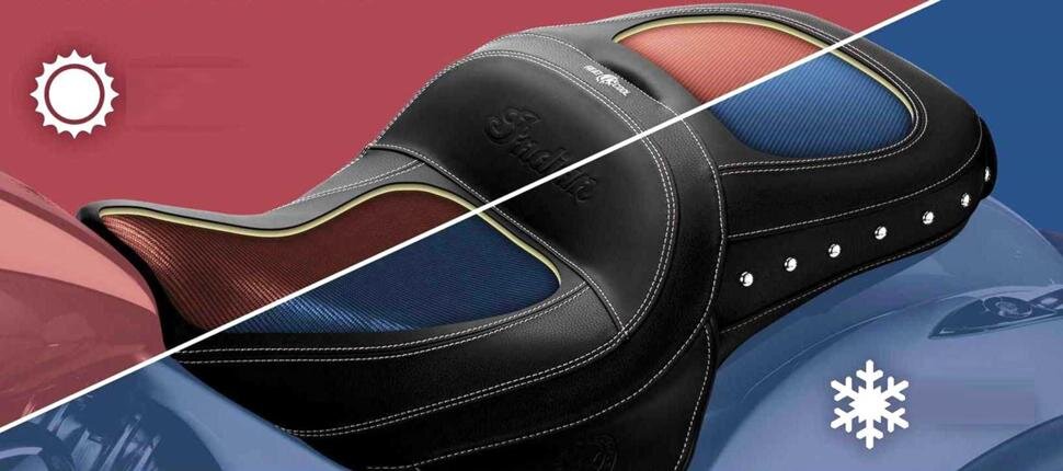 Однако, у экипировки есть ограничения. Например, продуваемый летний экип включает элементы из сетки или перфорированной кожи и имеет вентиляционные карманы, через которые проникает набегающий поток. Поэтому когда стоишь в пробке под палящим солнцем и этого потока нет - никакая сетка не поможет. А ранней весной и поздней осенью можно неплохо укутать тело и даже ноги, но вот кисти рук тем же набегающим потоком выстужает моментально. Вот тут-то и оценишь возможность оснастить мотоцикл системой управления температурой. Подогрев ручек и сидений - весьма популярные аксессуары в каталогах мотопроизводителей, чего не скажешь о системах охлаждения и вентиляции. Такие вещи приходится искать у сторонних производителей, и далеко не всегда они действительно эффективны и качественно изготовлены. К радости многих, Indian Motorcycle всерьёз задумались над этим вопросом и выпустили сиденье с климат контролем - встроенной системой подогрева и охлаждения.