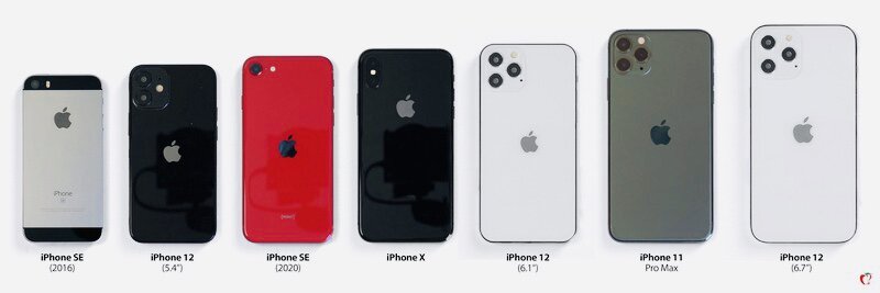 Этой осенью Apple планирует выпустить iPhone 12, который, по слухам, будет 3 разных размеров: 5,4″, 6,1″ и 6,7″. Средний совпадает с iPhone 11, а вот другие два отличаются от имеющихся айфонов. Редакторы MacRumors приобрели макет нового смартфона, основанного на слухах, и наглядно сравнили его с другими моделями. Смотрите сами: 5,4-дюймовый iPhone 12 немного больше iPhone SE первого, но меньше второго поколения. При этом iPhone 12 Pro Max с диагональю 6,7 дюймов — самый большой айфон из имеющихся. Он слегка больше по размерам, чем iPhone 11 Pro Max.