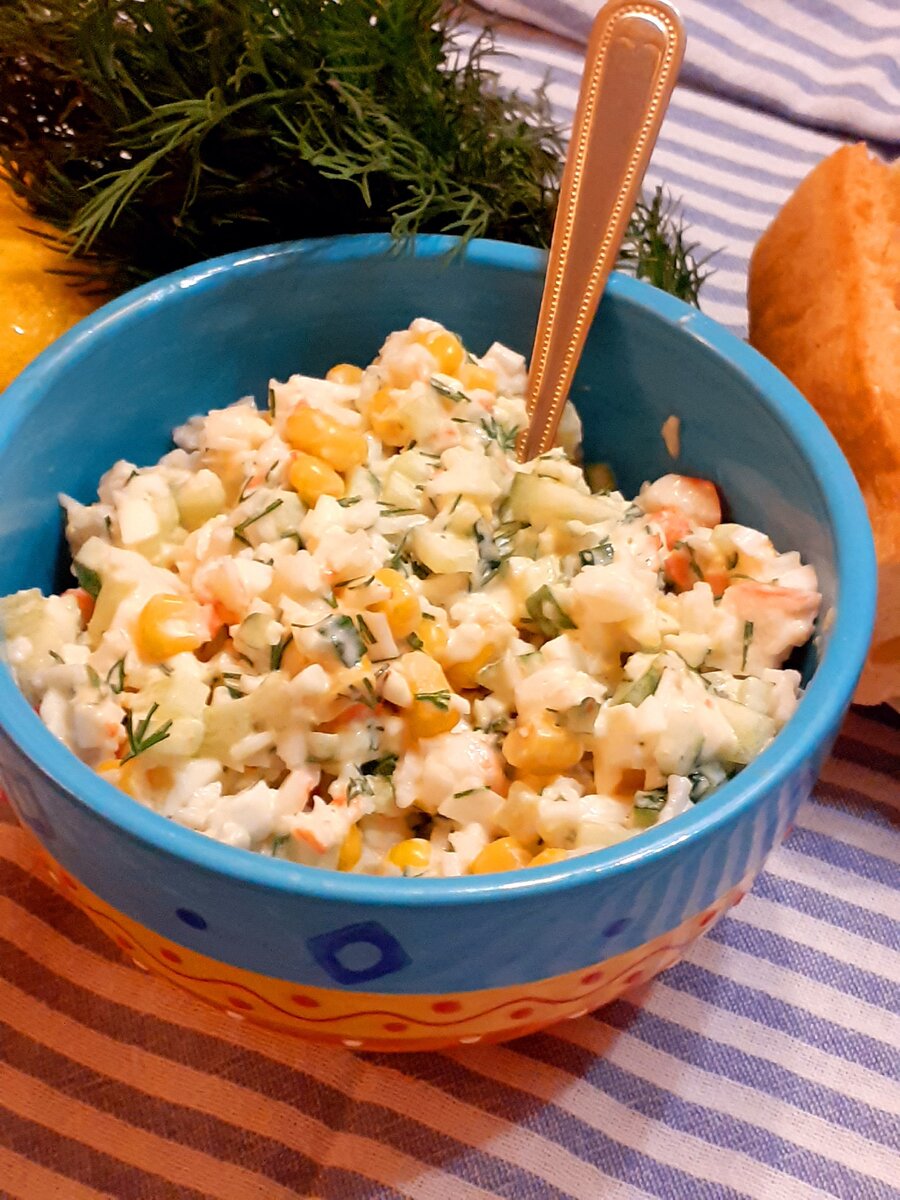 Обычно я готовлю этот простой но очень вкусный салат, когда ко мне приезжают гости с детьми. Уж очень им нравиться этот свежий и легкий салатик. На приготовление уходит минут 15, ингредиенты очень простые.