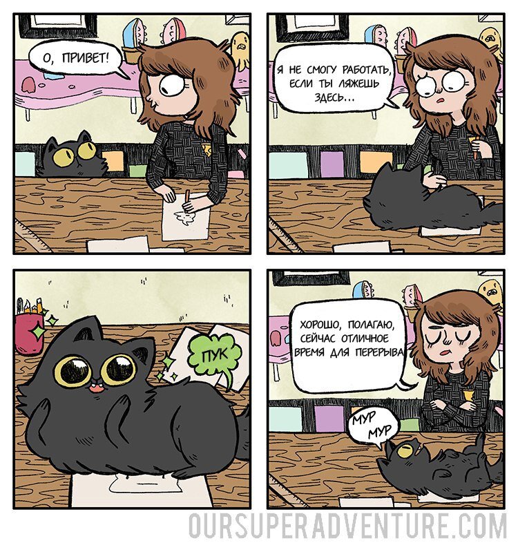 Приветик всем! Прошлая часть вам понравилась, поэтому вторая не заставила себя долго ждать! Для тех, кто не в курсе - авторы этой серии комиксов, это Сара Грейли и Стеф Пьюренинс. Они рисуют комиксы с 2012 года и повествуют о их милых историях совместной жизни вместе с четырьмя кошками. Название серии - Our Super Adventure (Наши Супер Приключения). Выкладывают они свои работы на собственном сайте - oursuperadventure.com (Первая часть в конце статьи) Приятного просмотра! Кот и работа Как?? Глупый вид "А как же я? :(" Все ли на месте?) Ох уж этот взгляд Неловко вышло... Залипательное шоу Как и обещал, вот ссылка на первую часть - (кликни на меня). Спасибо за просмотр! Оцените статью лайком, если она вам понравилась, подписывайтесь на канал, у нас новые статьи выходят ежедневно, а также не забывайте писать комментарии с предложениями о чем сделать новую подборку! А пока можете почитать другие наши статьи, они не менее интересные: